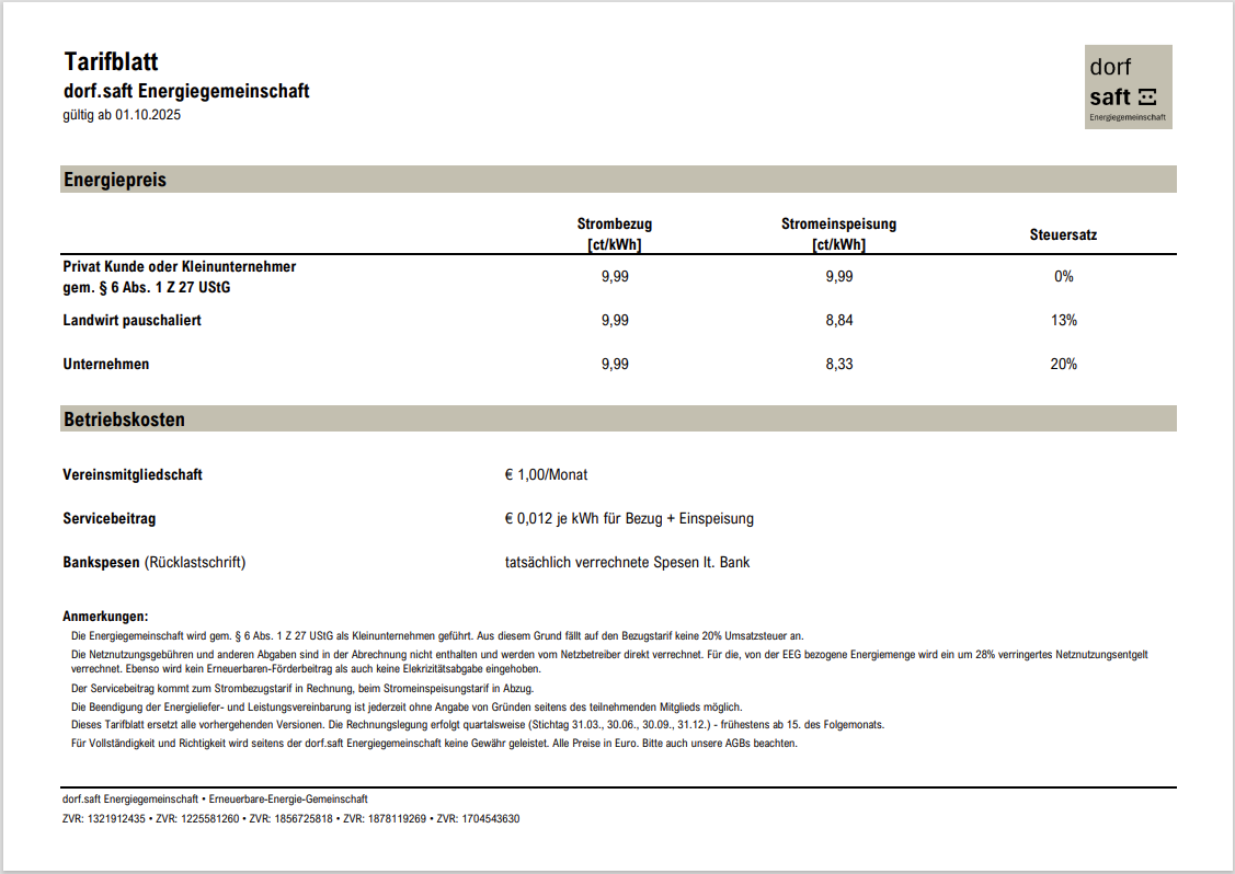 Tarifblatt Q4.2025 – dorf.saft Energiegemeinschaft